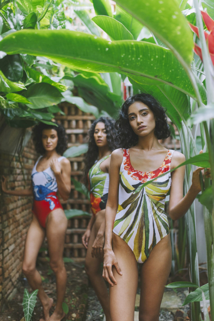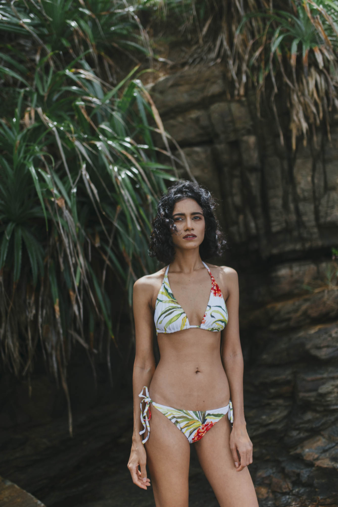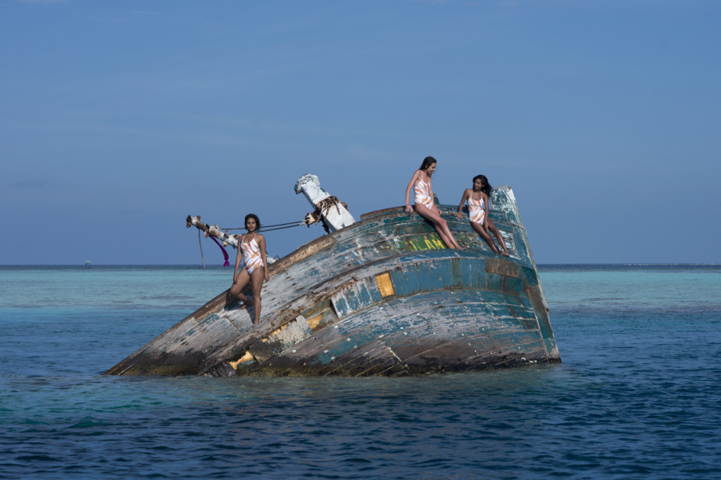 As mentioned, many of the pieces are based on local paintings by Maldivian artists and the colors of the collection are seashore reminiscent. More specifically, when speaking about the painting that inspired the Marla swimsuit in the collection, the Jaleel siblings said, “the painting for Marla really struck me and when the swimsuit was designed it reminded me of Helena Bonham Carter’s character, Marla from Fight Club. From then on, we rereferred to the swimsuit as Marla, and the name just stuck.” The other prints — the distinct flower, screwpine, and crab featured in the one piece and bikinis in the collection have made splashes in the fashion scene both in the Maldives and across Europe.