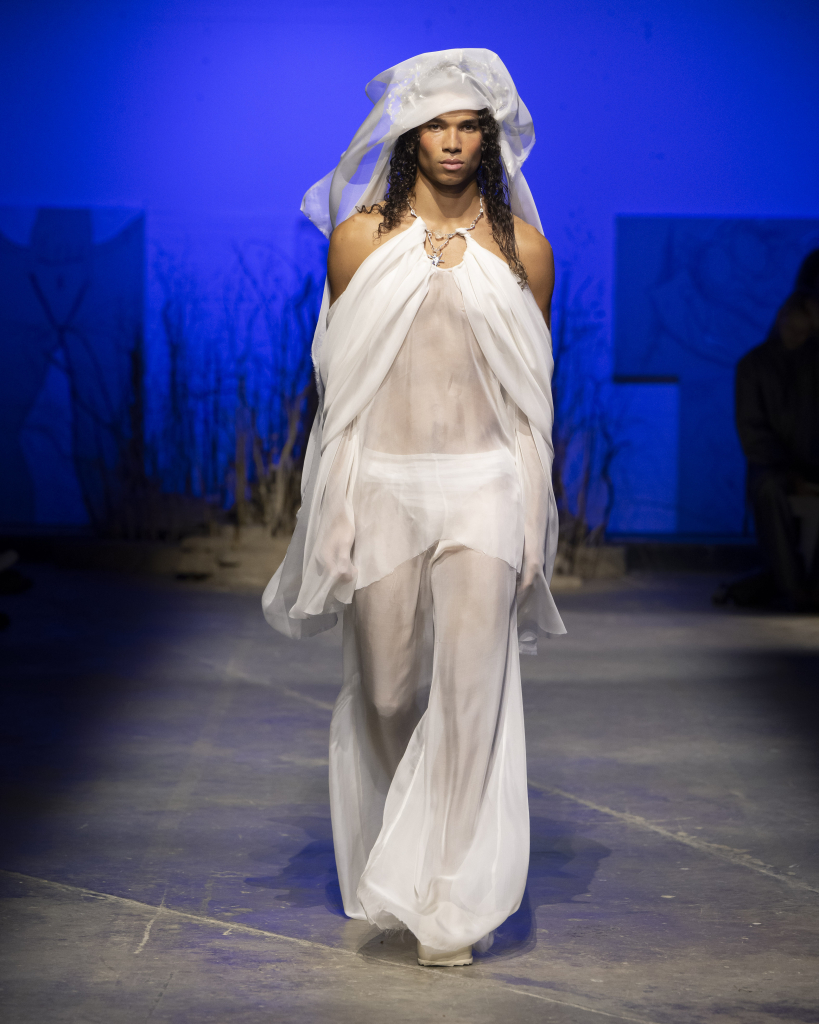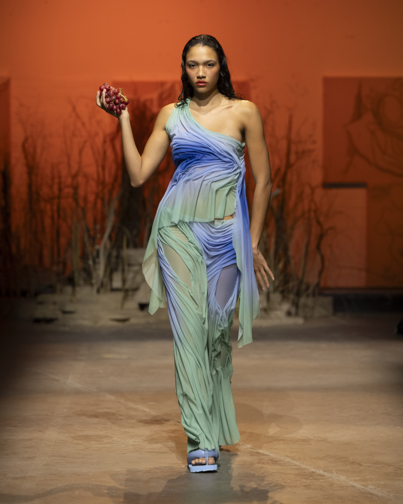 The feeling of a sun-kissed summer is evoked through the ‘tan lines’ carefully drawn onto the bodies of the models. Coupled with this is the brand’s signature drapery, seemingly floating around from the cool summer breeze. Each piece of the collections couples the ordinary with the mythical, transporting us into the ethereal world built by the designer and her creative team.